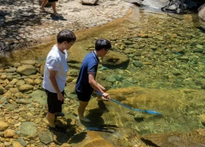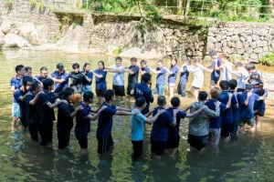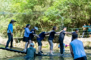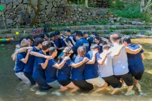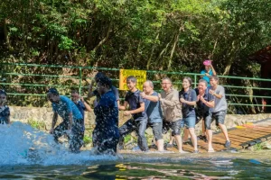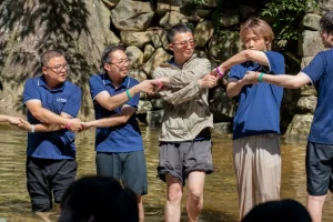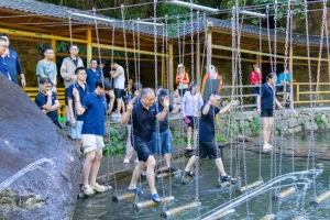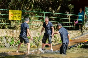 同心结”手链解锁: 队员们赤足踏入清凉溪水,围圈紧握,钻跨转智解人结,清凉触感间拉近心距!。